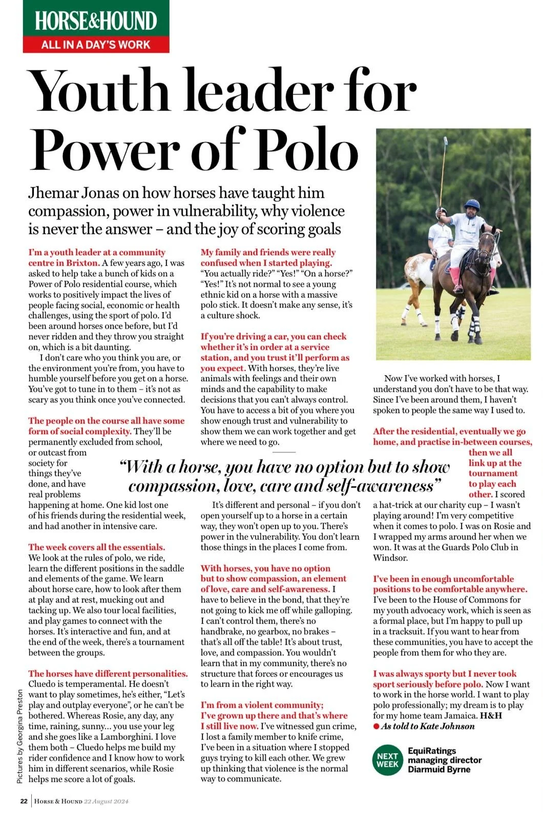 Power of Polo Youth Leader Jhemar Jonas in Horse and Hound, August 2024